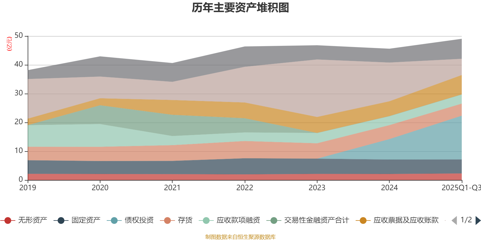 资产重大变化方面,截至2025年三季度末,公司货币资金较上年末减少57.98%,占公司总资产比重下降17.98个百分点;债权投资较上年末增加114.38%,占公司总资产比重上升15.45个百分点;应收票据及应收账款较上年末增加30.98%,占公司总资产比重上升2.46个百分点;存货较上年末减少13.69%,占公司总资产比重下降2.11个百分点。