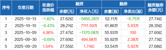 融资方面,当日融资买入2.57亿元,融资偿还3.16亿元,融资净偿还5850.28万元。融券方面,融券卖出7.59万股,融券偿还17.34万股,融券余量52.11万股,融券余额1154.31万元。融资融券余额合计27.74亿元。