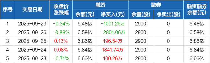 航天晨光:融资净偿还1001.26万元,融资余额6.48亿元(09-29)