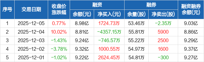 融资方面,当日融资买入1.16亿元,融资偿还9905.17万元,融资净买入1724.73万元。融券方面,融券卖出100股,融券偿还2.36万股,融券余量53.46万股,融券余额490.76万元。融资融券余额合计9.03亿元。