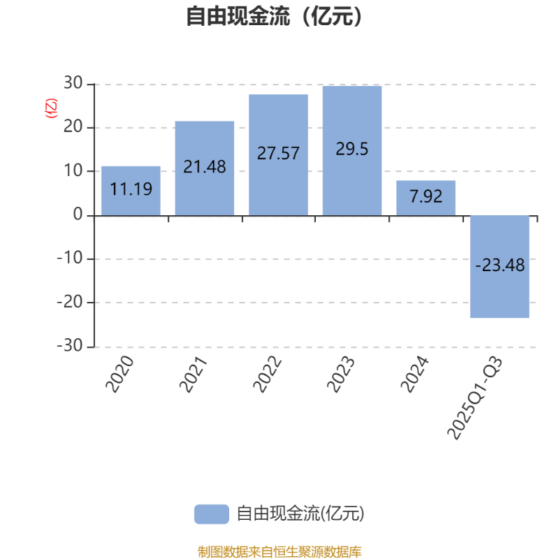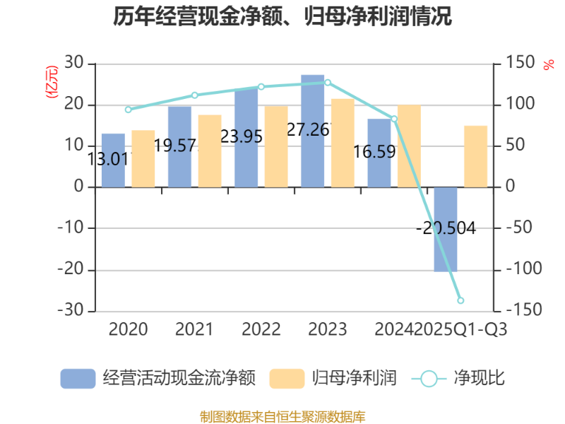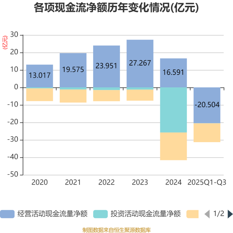 2025年前三季度,公司经营活动现金流净额为-20.5亿元,同比减少10.21亿元;筹资活动现金流净额-10.76亿元,同比增加3.95亿元;投资活动现金流净额-787.45万元,上年同期为-1.41亿元。