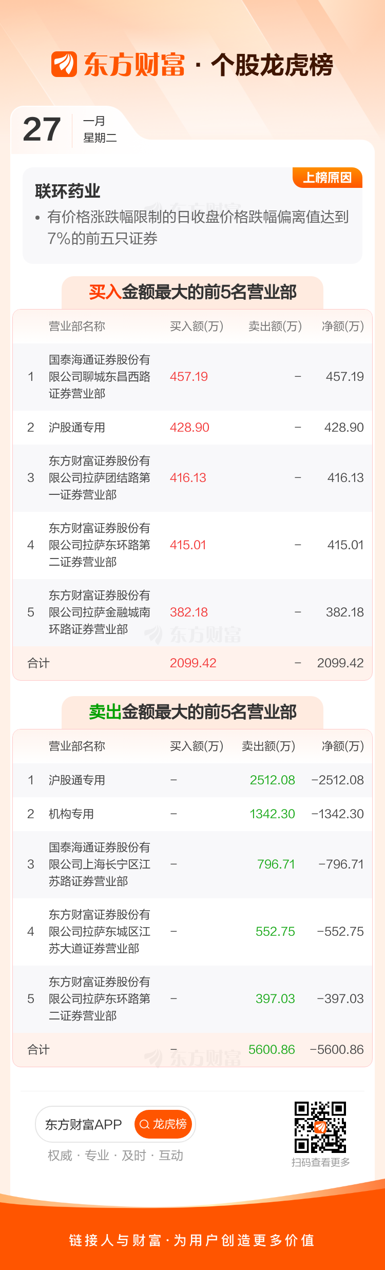 交易所2026年1月27日公布的交易公开信息显示,联环药业因成为有价格涨跌幅限制的日收盘价格跌幅偏离值达到7%的前五只证券上榜。联环药业当日收报19.51元,涨跌幅-7.88%,偏离值-8.06%,换手率6.92%,成交额3.91亿。