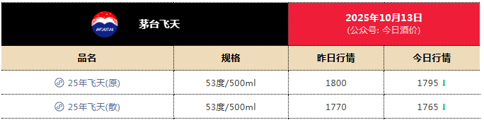然而,与段永平的乐观情绪形成对比的是,茅台当前面临的市场环境并不乐观。根据第三方平台“今日酒价”数据,10月13日,2025年53度500ml飞天茅台散瓶批发价已跌至1765元,原箱价报1795元,较去年同期下降近35%。国庆中秋双节期间,飞天茅台批发价连续多日低于1800元,旺季不旺成为行业普遍现象。