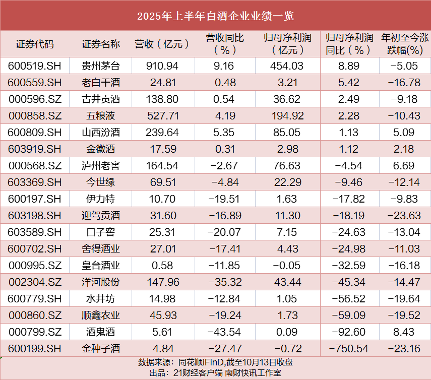 白酒企业的业绩也出现较为明显分化。18家A股上市白酒企业中,12家2025年上半年的净利润同比下滑,占比超六成。部分腰部及区域品牌企净利润跌幅超40%。不过,贵州茅台、五粮液、山西汾酒等头部品牌仍维持一定增速。其中,贵州茅台2025年上半年的归母净利润达454.03亿元,同比增长8.89%,表现相对稳健。
