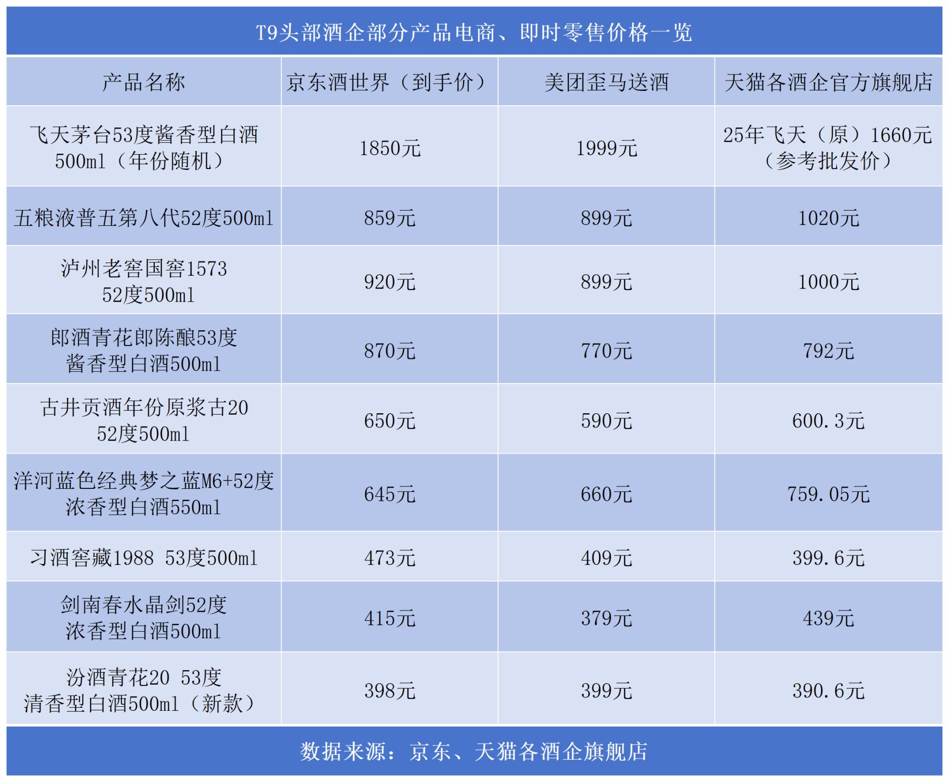 记者近日对比T9头部酒企部分产品电商、即时零售平台的价格发现,在即时零售平台上,飞天茅台、五粮液、泸州老窖等大部分名酒的价格普遍低于天猫各酒企官方旗舰店,差价大概在几十元到百元。