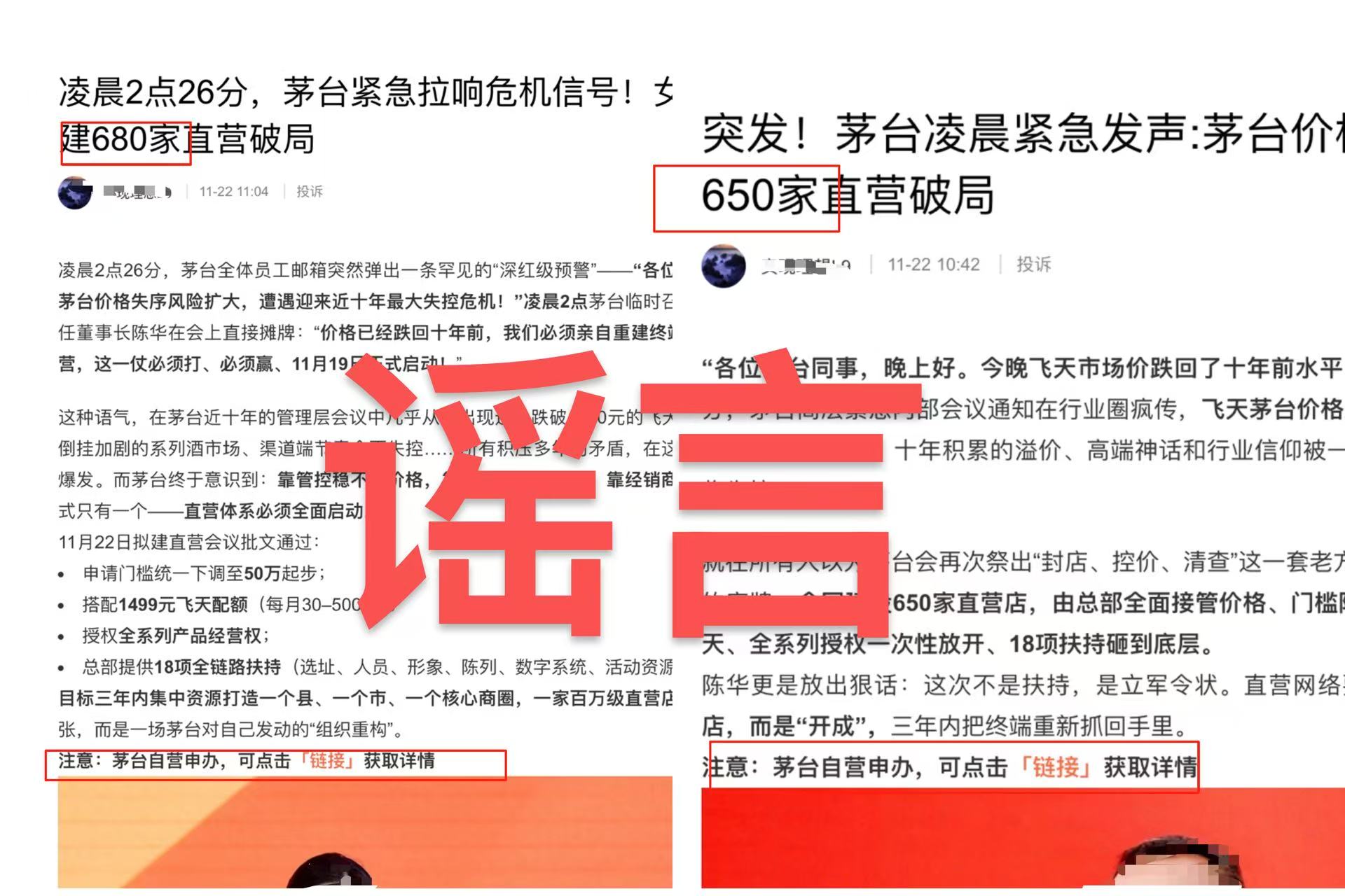 社交平台还流传多个开店数字的版本。另一账号11月22日10时52分也发布相关文章,而这篇文章则称“茅台公开宣布——全国要落地800家茅台自营门店”。