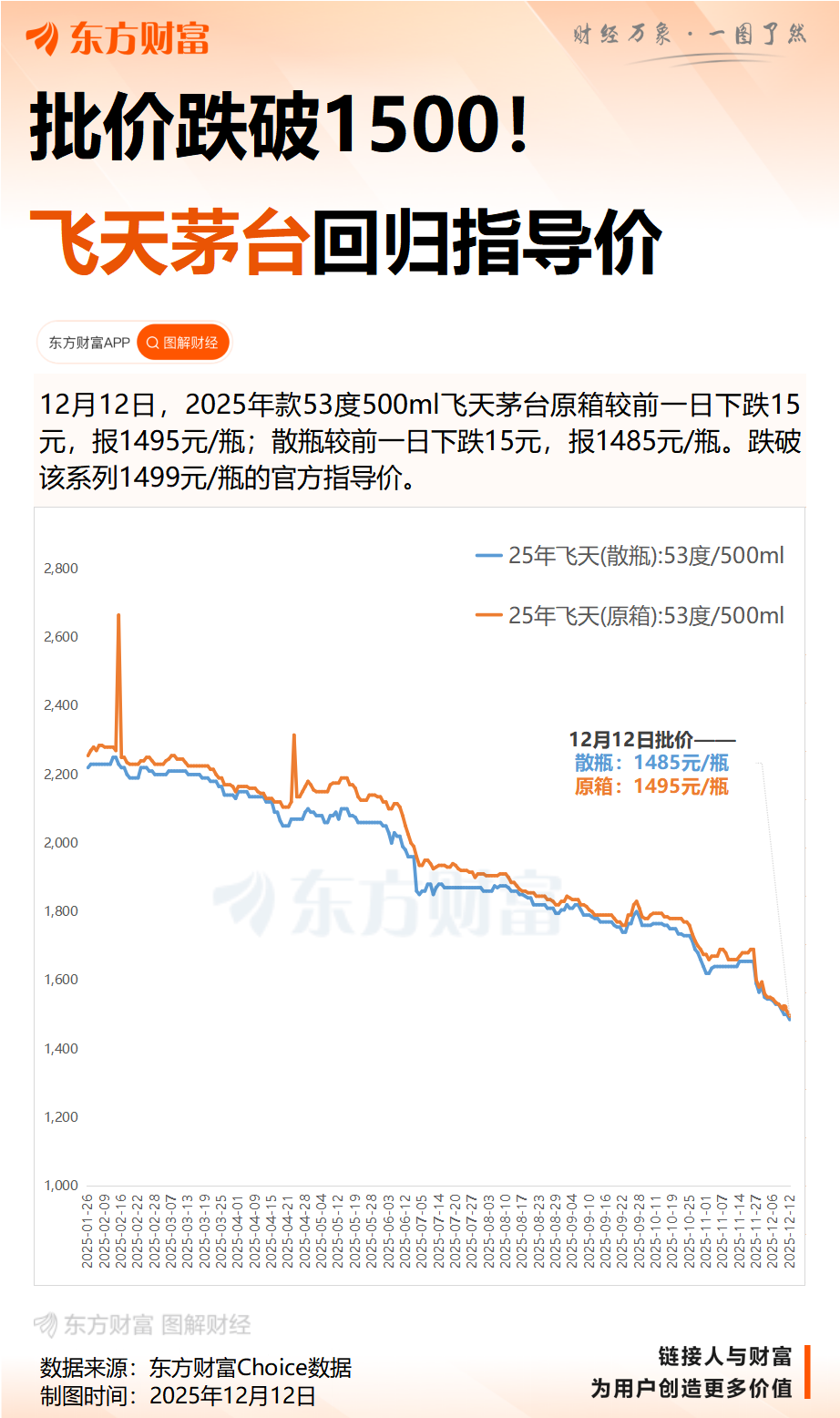 12月12日,今日酒价披露的各大名酒批发参考价显示,2025年款53度500ml飞天茅台原箱较前一日下跌15元,报1495元/瓶;散瓶较前一日下跌15元,报1485元/瓶。跌破该系列1499元/瓶的官方指导价。