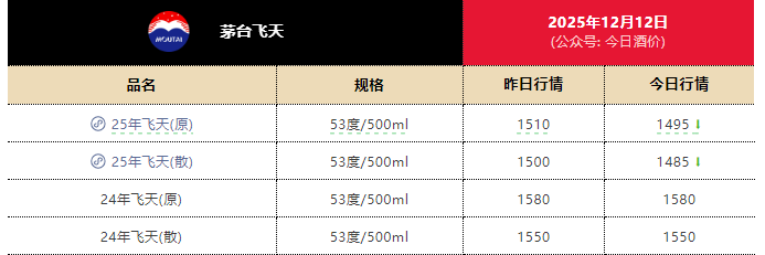 12月12日,据今日酒价披露的各大名酒批发参考价,2025年53度500ml飞天茅台的原箱价格较前一日下跌15元,报1495元/瓶;同款飞天茅台的散瓶价格则较前一日下跌15元,报1485元/瓶。