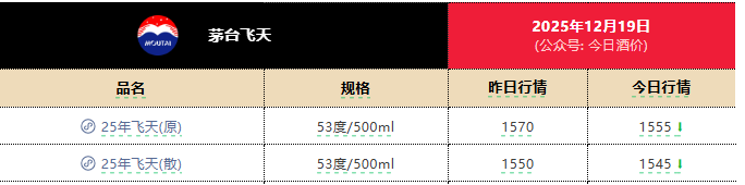 12月19日,第三方平台“今日酒价”数据显示,2025年53度500ml飞天茅台散瓶批发参考价为1545元,而18日价格为1550。