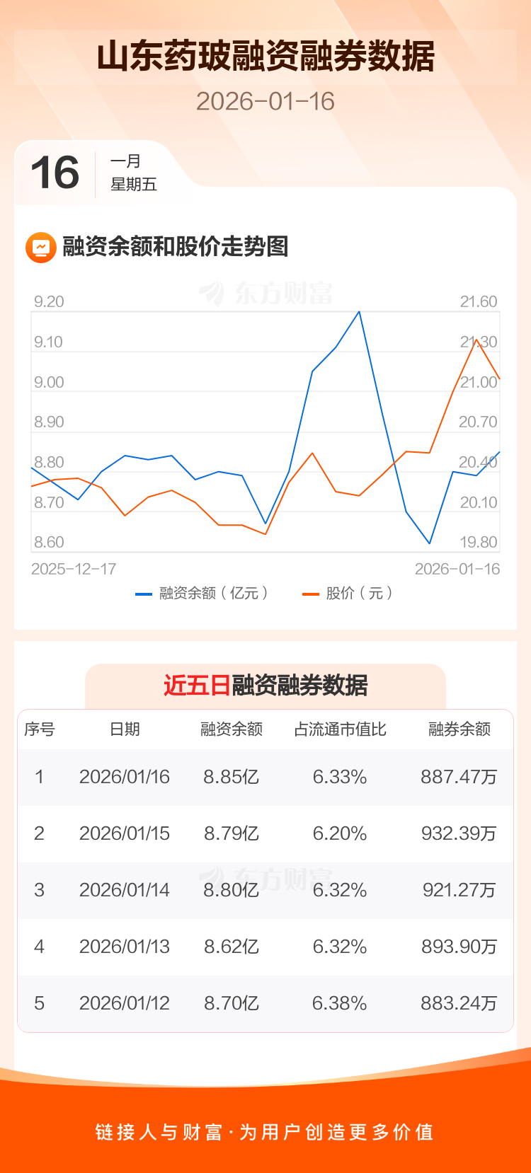交易所最新数据显示,山东药玻于2026年1月16日获融资买入5113.17万元,融资偿还4534.16万元,当日融资净买入579.01万元。目前,该股融资余额8.85亿,占流通市值比例为6.33%。
