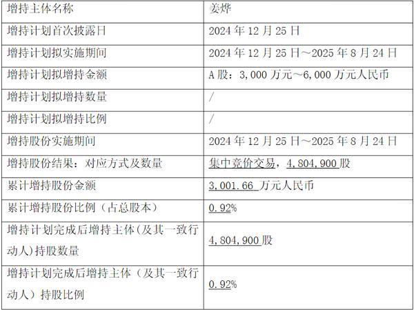 综合上交所官网信息及公告,6月24日,姜烨以集中竞价交易方式合计增持了公司股份36.33万股,增持金额约为200万元。今年8月姜烨多次实施增持计划,于19日、20日、21日及24日,分别增持公司160万股、65.74万股、186.9万股和31.56万股,对应的成交均价分别为6.19元/股、6.24元/股、6.42元/股及6.43元/股,增持金额分别为988.8万元、410.22万元、1199.64万元和203.04万元。本次增持计划已在承诺期限内实施完毕。