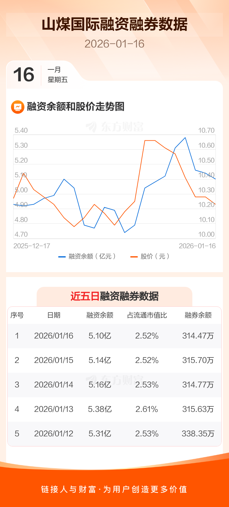 交易所最新数据显示,山煤国际于2026年1月16日获融资买入2680.38万元,融资偿还3020.00万元,当日融资净偿还339.62万元。目前,该股融资余额5.10亿,占流通市值比例为2.52%。