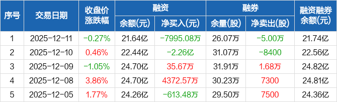 厦门钨业:融资净偿还7995.08万元,融资余额21.64亿元(12-11)