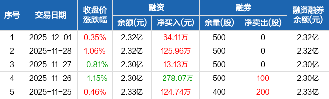 融资方面,当日融资买入519.93万元,融资偿还455.82万元,融资净买入64.11万元,连续3日净买入累计203.2万元。融券方面,融券卖出0股,融券偿还0股,融券余量500股,融券余额4325元。融资融券余额合计2.32亿元。