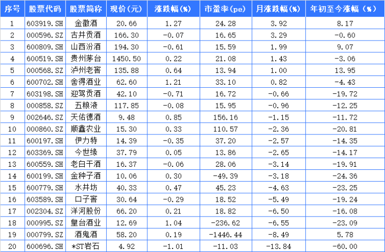 数据显示,20只白酒A股当月6家上涨,14家下跌。