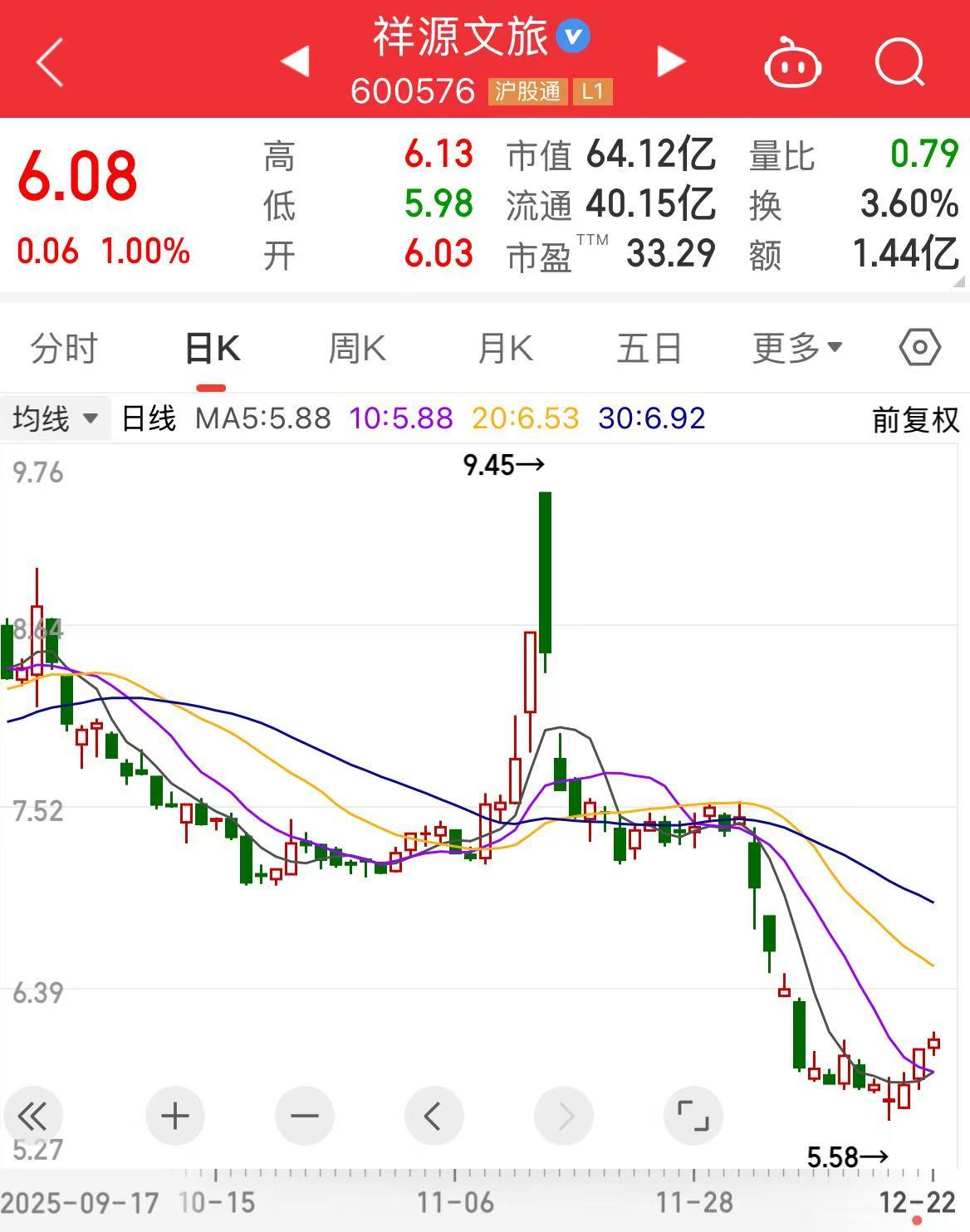 盘面上,截至今日收盘,祥源文旅股价涨1%,报6.08元,总市值64.12亿元。