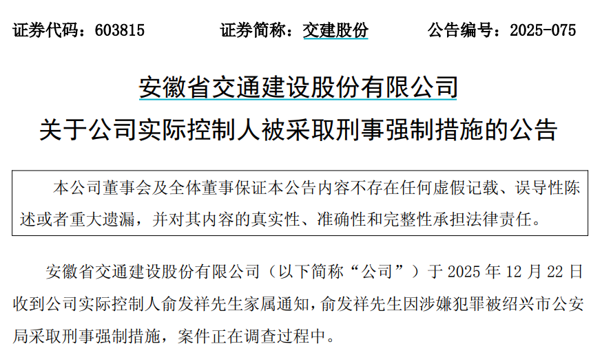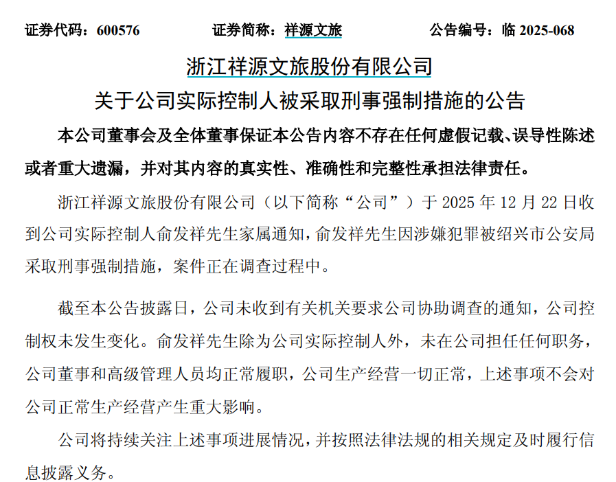 12月22日晚间,A股两家上市公司——交建股份、祥源文旅,港股公司海昌海洋公园,同步发布公告,公司实控人俞发祥因涉嫌犯罪,被绍兴市公安局采取刑事强制措施,案件正在调查过程中。