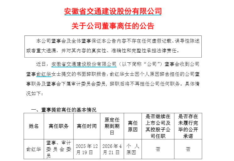此外,交建股份当天还发布了一则关于公司董事离任的公告,公告显示,公司董事俞红华因个人原因辞去担任的公司董事职务及董事会下属审计委员会委员,辞职后将不再担任公司任何职务。