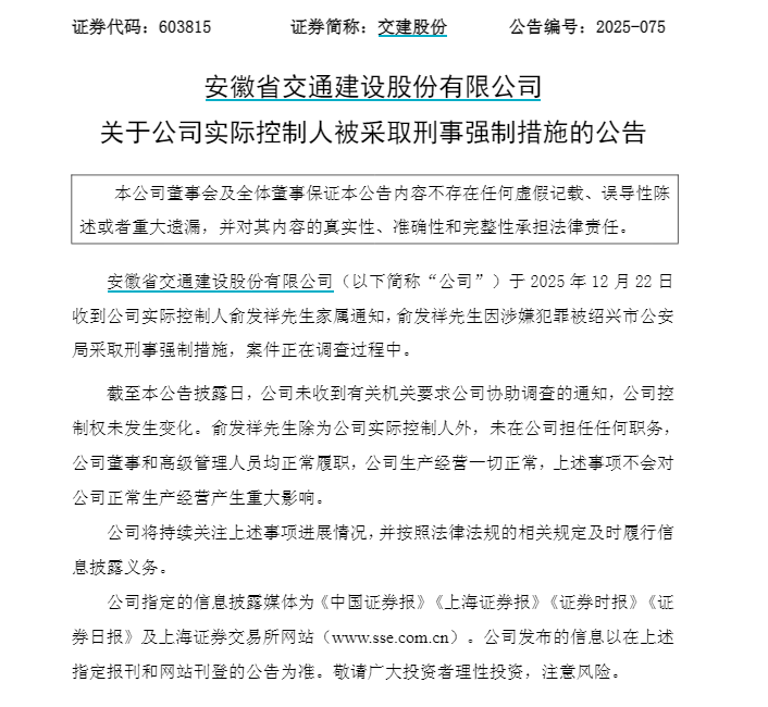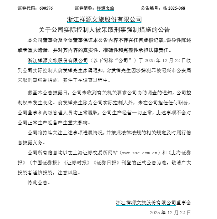 祥源文旅、交建股份公告显示,公司于2025年12月22日收到公司实际控制人俞发祥先生家属通知,俞发祥先生因涉嫌犯罪被绍兴市公安局采取刑事强制措施,案件正在调查过程中。