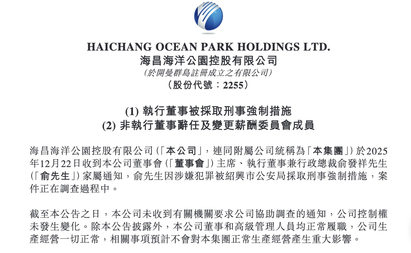 12月22日盘后,接手两个月后,海昌海洋公园(02255)的新实控人俞发祥,被采取刑事强制措施带走了。