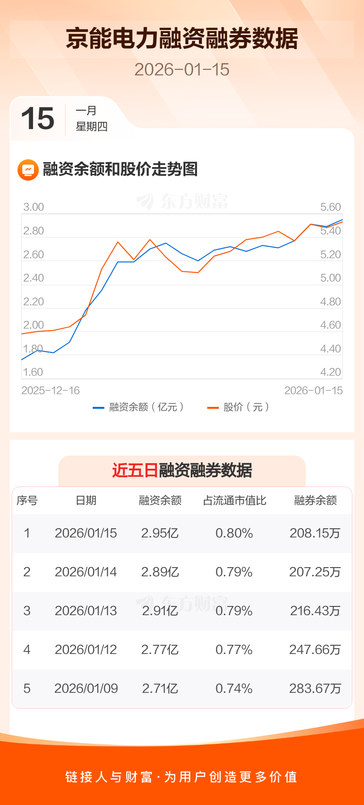 交易所最新数据显示,京能电力于2026年1月15日获融资买入2464.01万元,融资偿还1831.02万元,当日融资净买入632.99万元。目前,该股融资余额2.95亿,占流通市值比例为0.80%。