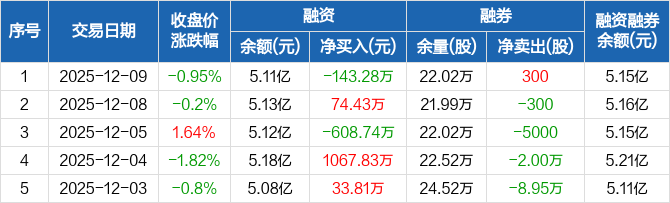 北大荒:融资净偿还143.28万元,融资余额5.11亿元(12-09)