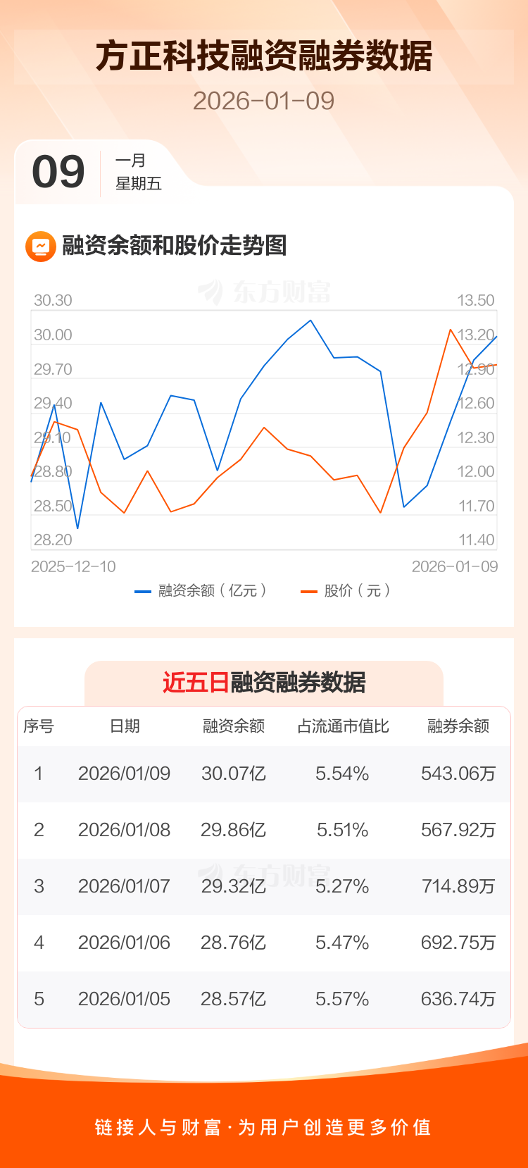交易所最新数据显示,方正科技于2026年1月9日获融资买入3.60亿元,融资偿还3.39亿元,当日融资净买入2056.26万元。目前,该股融资余额30.07亿,占流通市值比例为5.54%。