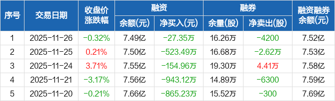 融资方面,当日融资买入3163.83万元,融资偿还3191.18万元,融资净偿还27.35万元,连续6日净偿还累计2545.84万元。融券方面,融券卖出600股,融券偿还4800股,融券余量16.26万股,融券余额308.61万元。融资融券余额合计7.52亿元。