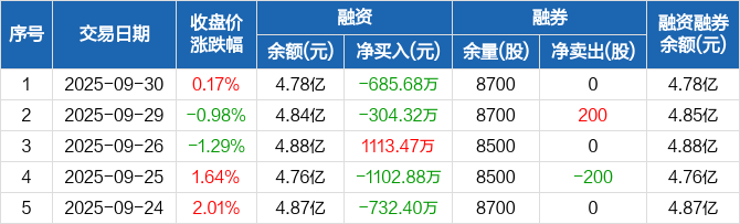大众交通:融资净偿还685.68万元,融资余额4.78亿元(09-30)