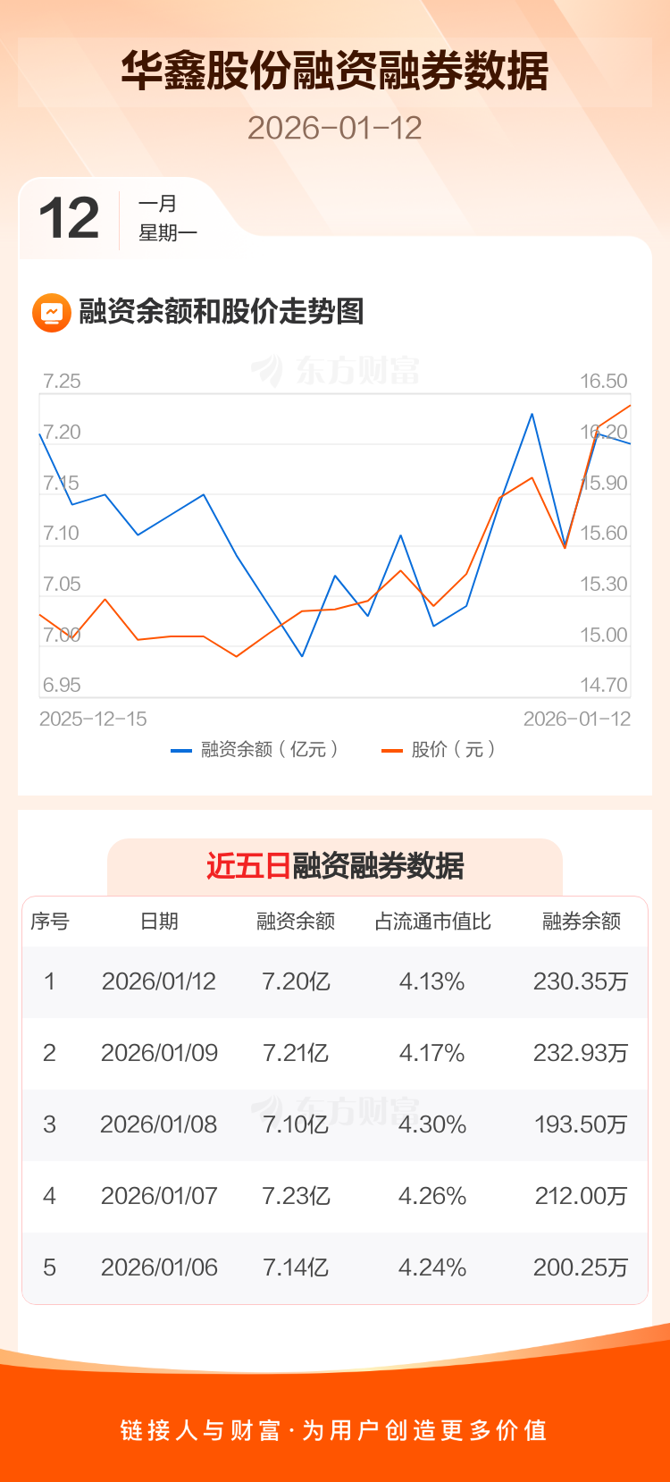 交易所最新数据显示,华鑫股份于2026年1月12日获融资买入1.22亿元,融资偿还1.23亿元,当日融资净偿还79.62万元。目前,该股融资余额7.20亿,占流通市值比例为4.13%。
