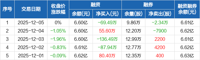 外高桥:融资净偿还69.49万元,融资余额6.6亿元(12-05)