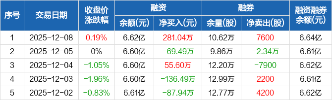 外高桥:融资净买入281.04万元,融资余额6.62亿元(12-08)