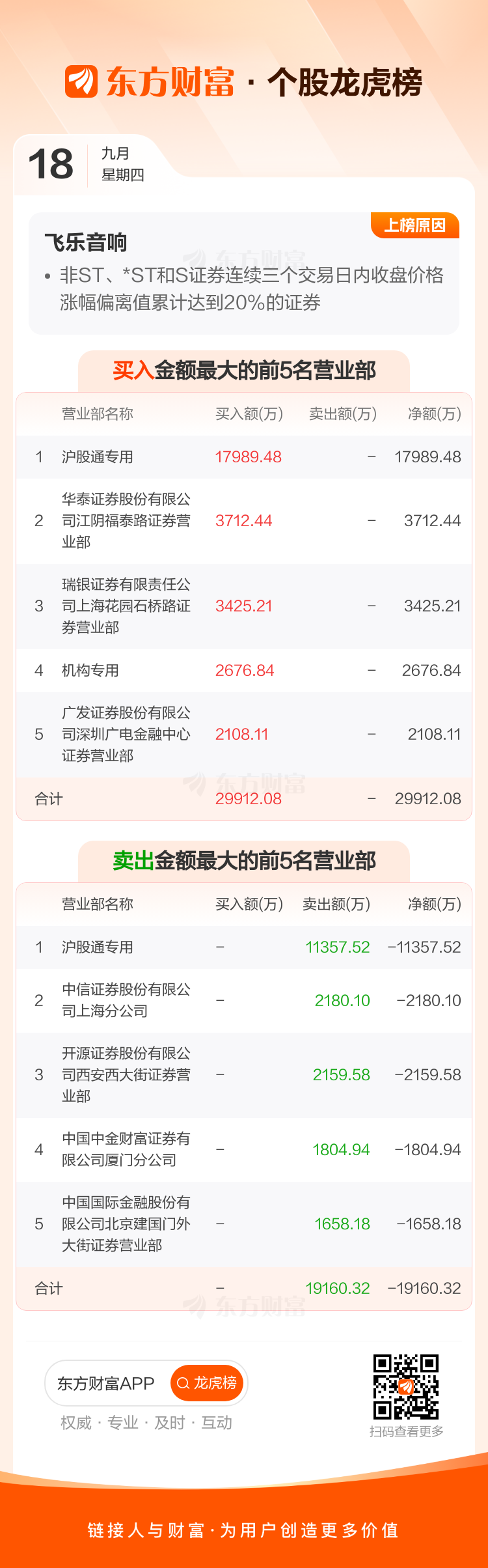 交易所2025年9月18日公布的交易公开信息显示,飞乐音响因成为非ST、*ST和S证券连续三个交易日内收盘价格涨幅偏离值累计达到20%的证券上榜。飞乐音响当日收报9.8元,涨跌幅9.99%,换手率6.05%,成交额14.67亿。异常期间9月17日至9月18日,期间涨幅20.99%,累计偏离值21.77%,区间成交额23.08亿。