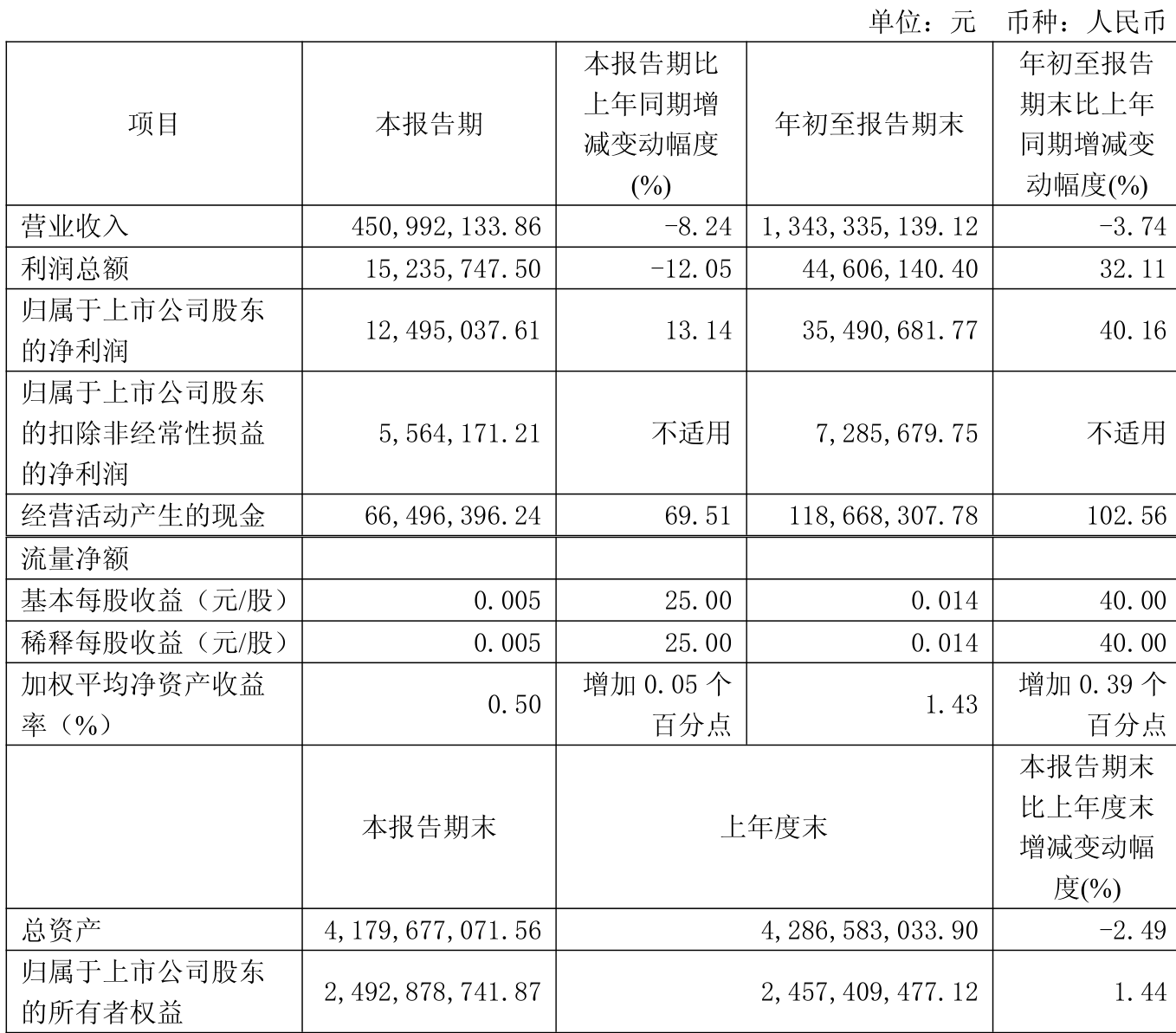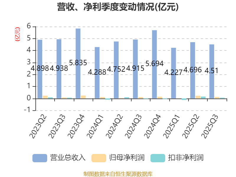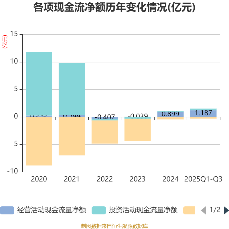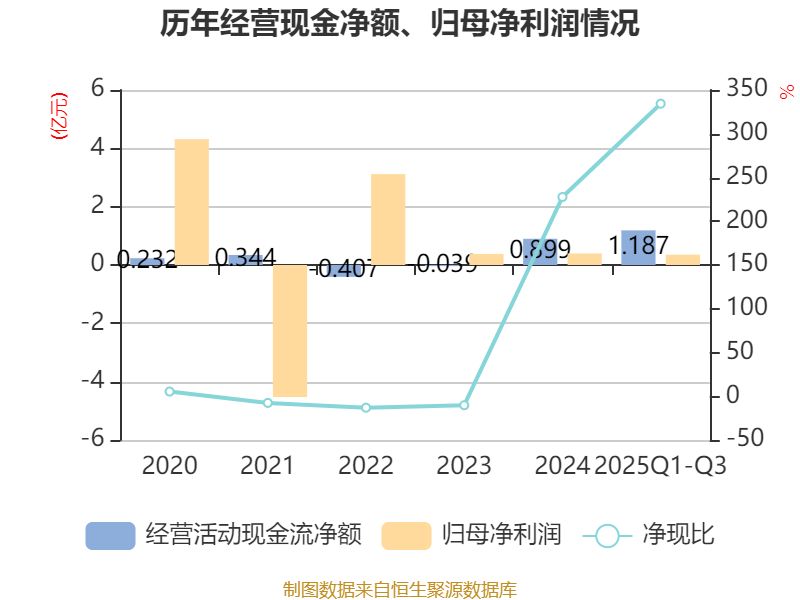 2025年前三季度,公司经营活动现金流净额为1.19亿元,同比增长102.56%;筹资活动现金流净额-3335.54万元,同比增加451.54万元;投资活动现金流净额2994.96万元,上年同期为1855.19万元。