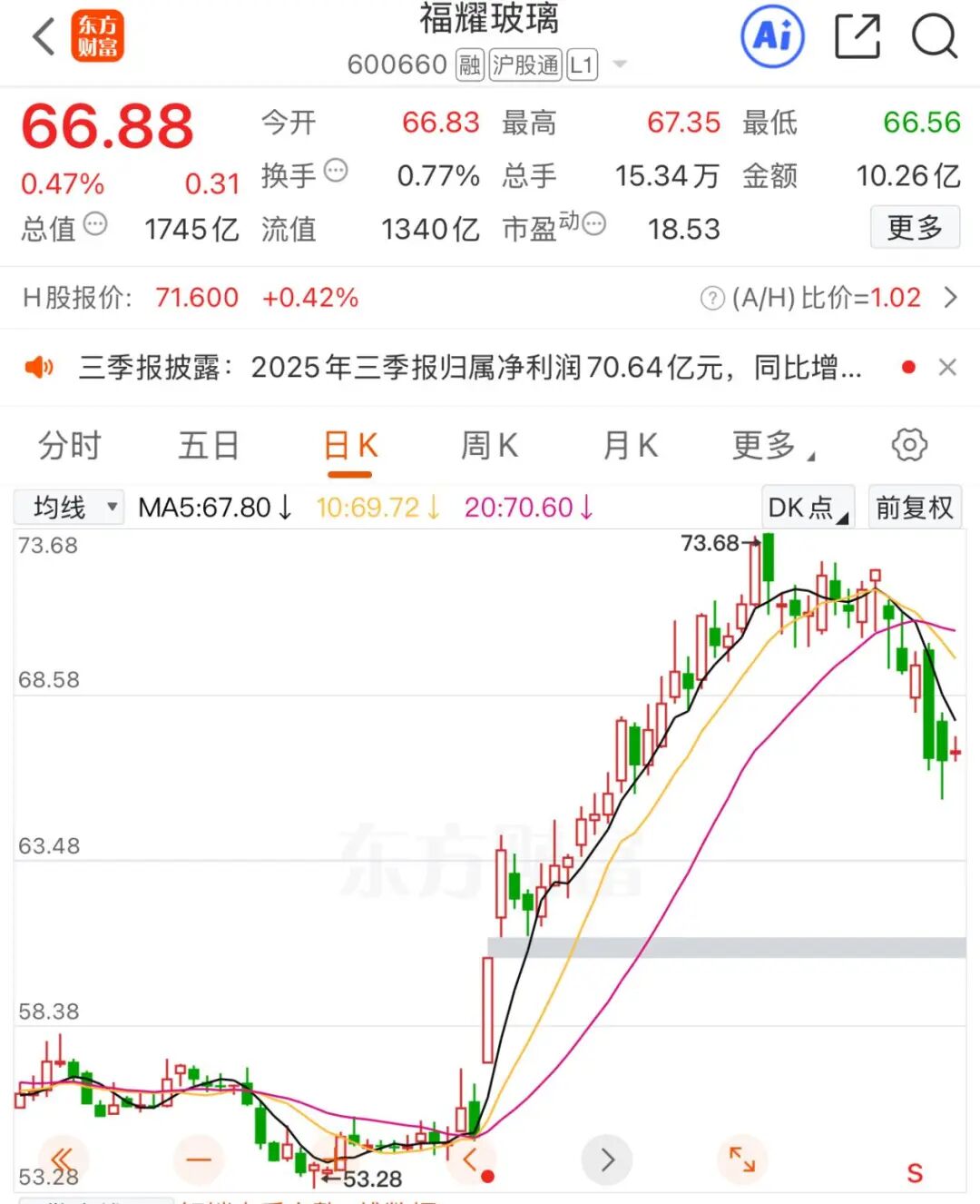 截至10月16日收盘,福耀玻璃股价收涨0.47%,报66.88元/股,最新市值超1700亿元人民币。