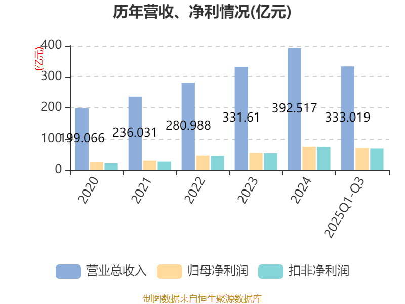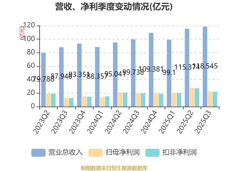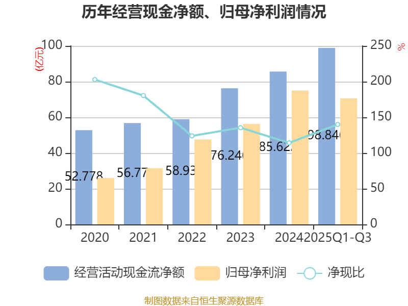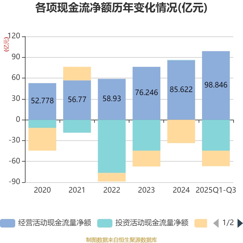 2025年前三季度,公司经营活动现金流净额为98.85亿元,同比增长57.29%;筹资活动现金流净额-22.36亿元,同比减少8.33亿元;投资活动现金流净额-44.52亿元,上年同期为-56.11亿元。