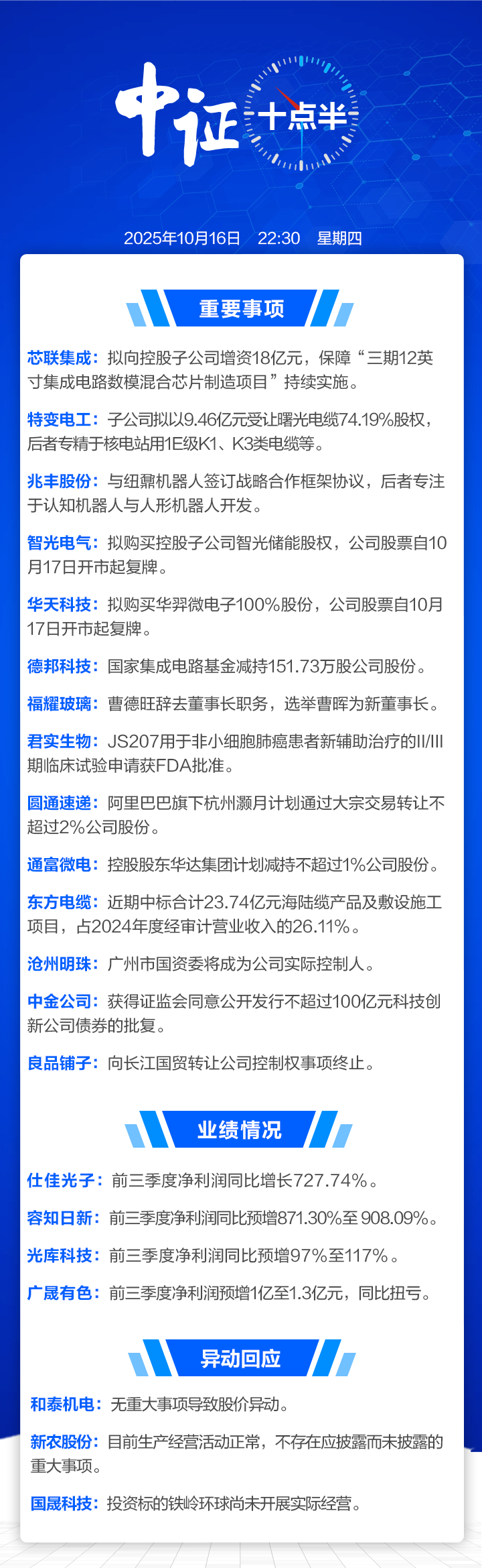 【中证十点半】曹德旺辞去福耀玻璃董事长职务;智光电气、华天科技明日复牌