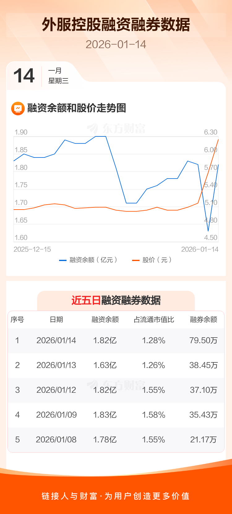 交易所最新数据显示,外服控股于2026年1月14日获融资买入3715.91万元,融资偿还1777.29万元,当日融资净买入1938.62万元。目前,该股融资余额1.82亿,占流通市值比例为1.28%。