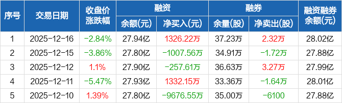融资方面,当日融资买入1.08亿元,融资偿还9483.32万元,融资净买入1326.22万元。融券方面,融券卖出3.25万股,融券偿还9300股,融券余量37.23万股,融券余额801.56万元。融资融券余额合计28.02亿元。