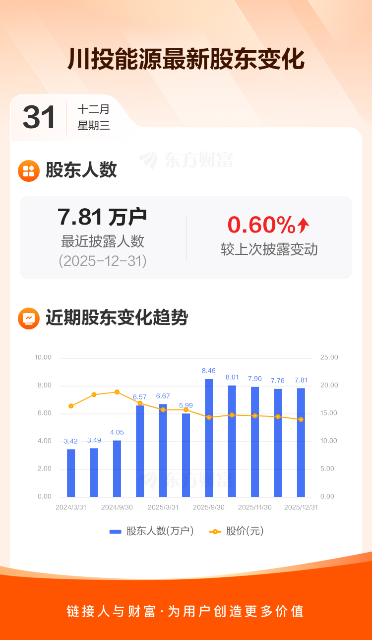 川投能源:截至12月31日最新股东户数7.81万户,较上期增加0.60%