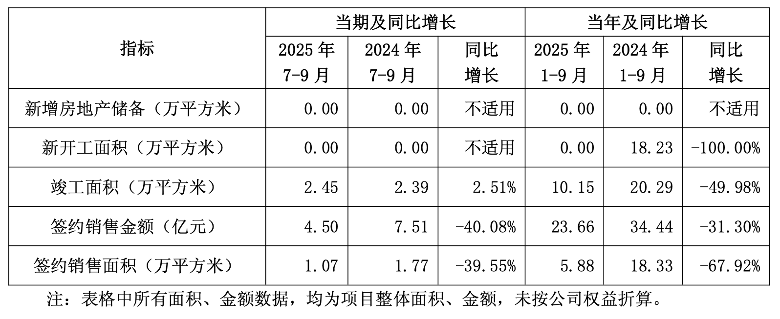 10月15日,京投发展(600683)披露第三季度主要经营数据,第三季度新增房地产储备为0平方米,新开工面积为0平方米,竣工面积2.45万平方米,同比增长2.51%;签约销售金额4.5亿元,同比减少40.08%;签约销售面积1.07万平方米,同比减少39.55%。