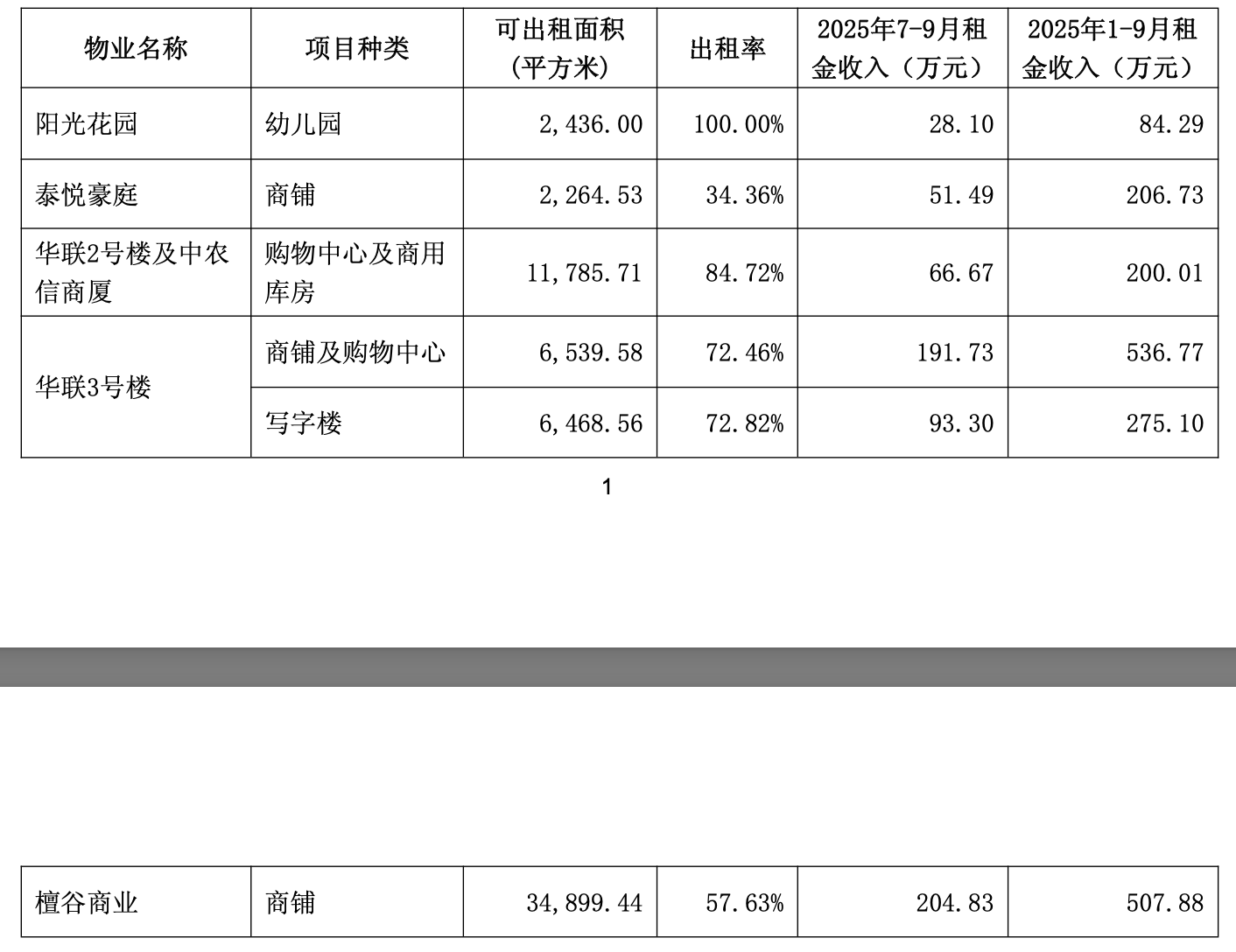 阳光花园幼儿园的可出租面积为2436平方米,出租率为100%,租金收入为28.1万元;泰悦豪庭商铺的可出租面积为2264.53平方米,出租率为34.36%,租金收入为51.49万元;华联2号楼及中农信商厦的可出租面积为1.18万平方米,出租率为84.72%,租金收入为66.67万元;华联3号楼的商铺及购物中心出租率为72.46%,租金收入为191.73万元。