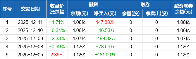 潞化科技:融资净买入147.88万元,融资余额1.08亿元(12-11)