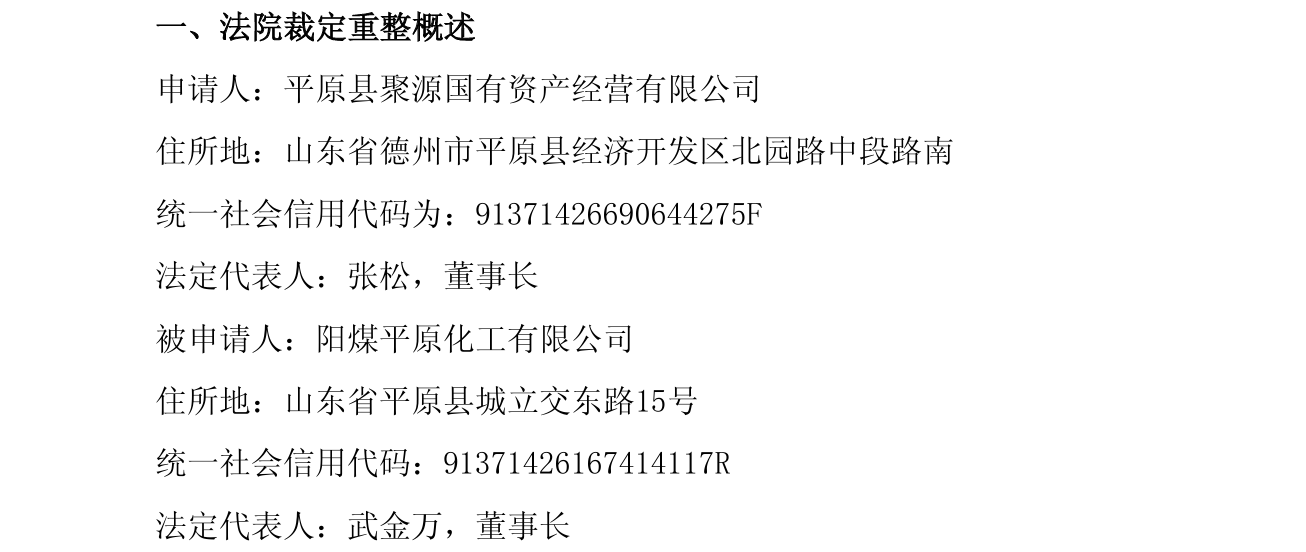 同时,平原化工管理人依据《中华人民共和国企业破产法》及相关法律的规定公开招募投资人,并于2025年12月16日在全国企业破产重整案件信息网发布《阳煤平原化工有限公司破产重整案招募投资人公告》。