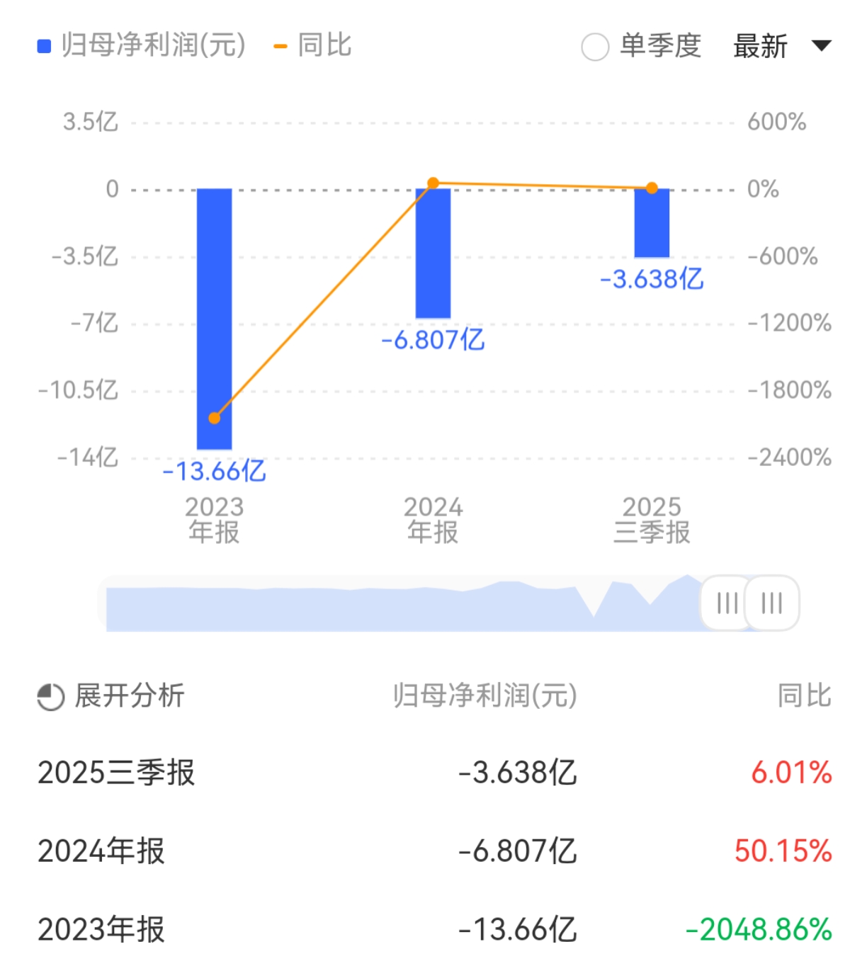 2025年前三季度,公司实现营业总收入75.17亿元,同比下降5.06%;归母净利润亏损3.64亿元,上年同期亏损3.87亿元;扣非净利润亏损3.96亿元,上年同期亏损4.39亿元。