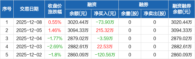 湖南天雁:融资净偿还73.9万元,融资余额3020.44万元(12-08)
