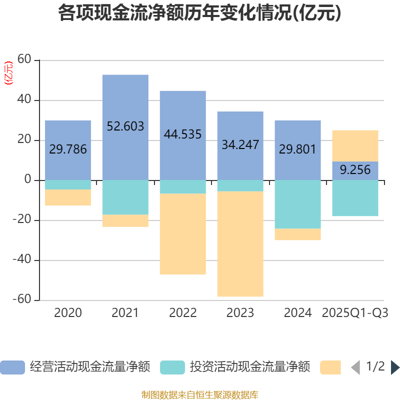 2025年前三季度,公司经营活动现金流净额为9.26亿元,同比下降64.58%;筹资活动现金流净额15.58亿元,同比增加32.06亿元;投资活动现金流净额-18.06亿元,上年同期为-14.15亿元。