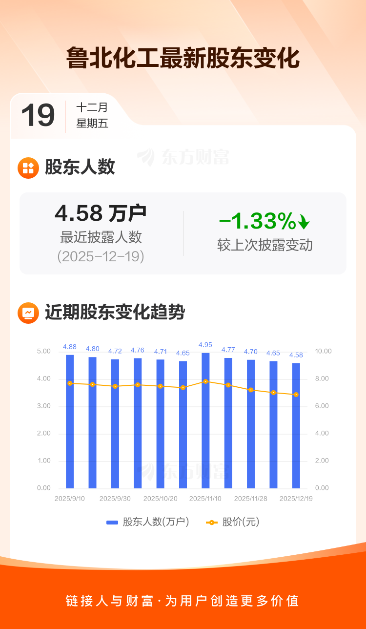 鲁北化工:截至12月19日最新股东户数4.58万户,较上期减少1.33%