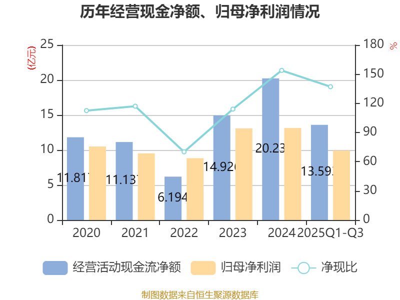 2025年前三季度,公司经营活动现金流净额为13.59亿元,同比下降10.77%;筹资活动现金流净额-12.14亿元,同比减少3.34亿元;投资活动现金流净额988.61万元,上年同期为-4.9亿元。