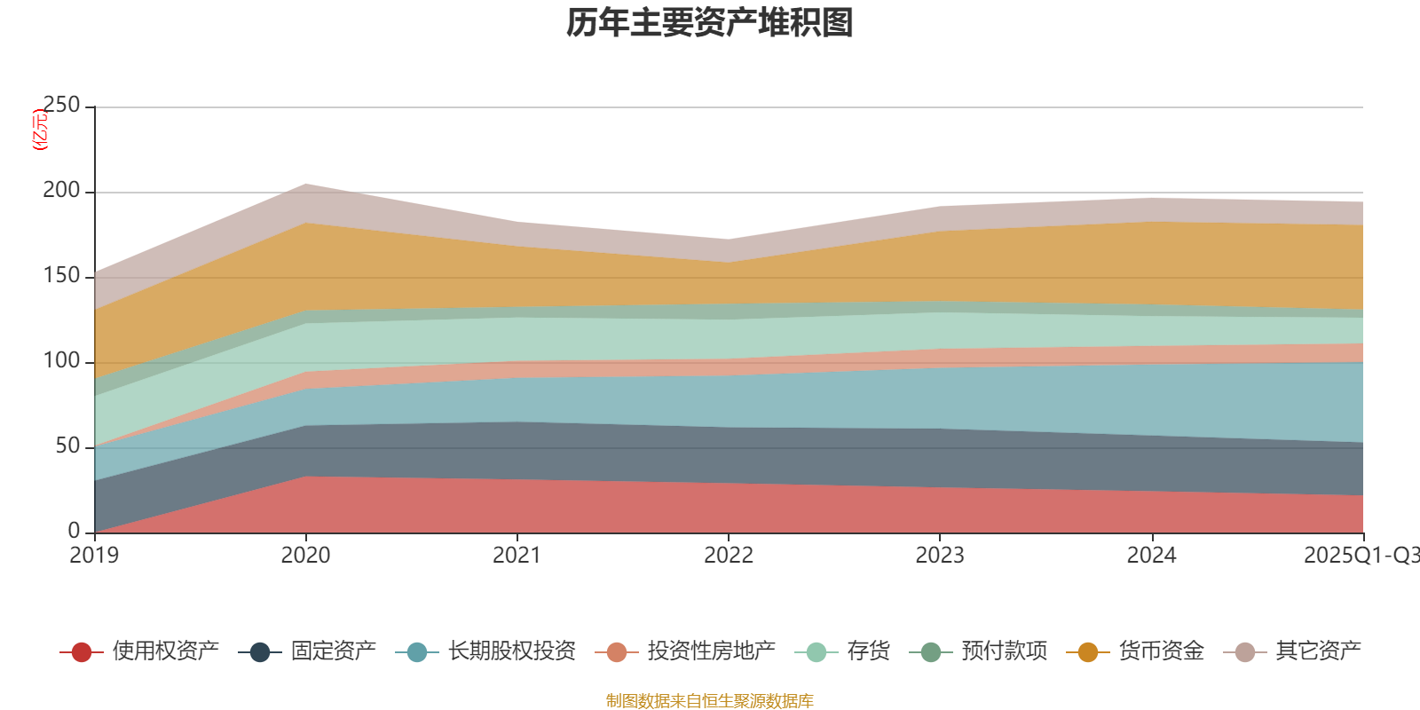 资产重大变化方面,截至2025年三季度末,公司长期股权投资较上年末增加13.24%,占公司总资产比重上升3.11个百分点;使用权资产较上年末减少10.64%,占公司总资产比重下降1.18个百分点;存货较上年末减少13.38%,占公司总资产比重下降1.09个百分点;预付款项较上年末减少30.92%,占公司总资产比重下降1.07个百分点。